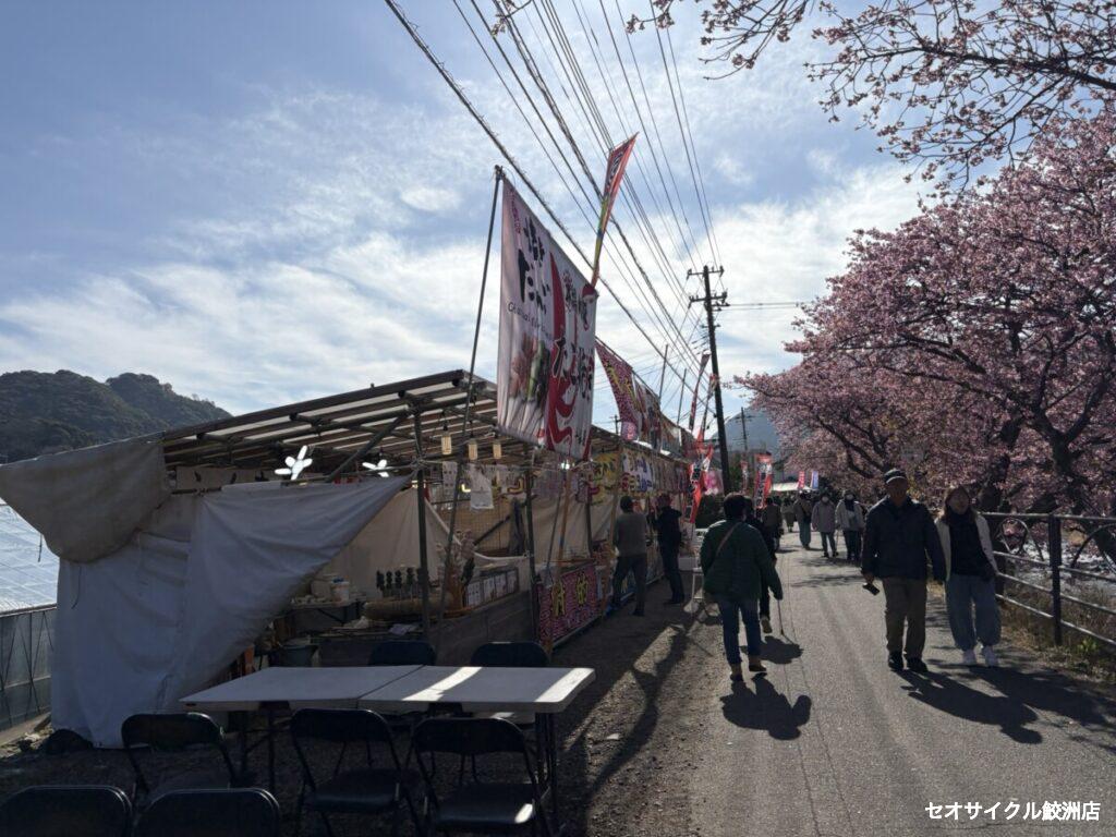 下ること約15分。河津川沿いの桜祭りの会場が見えてきました。