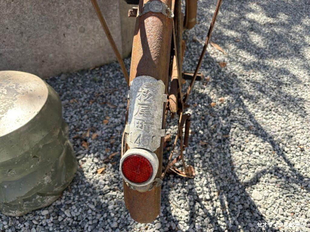 ロッドブレーキに昔の防犯登録?と思われるスチールプレートのナンバーが