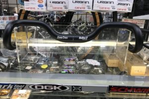 まず見たことない形状のドロップバー。フラット部分を上方に6cmくらい上げてあまり前傾しない楽な姿勢でロードに乗るためのバー。アメリカでは流行ってるらしいです。 ドロップのアール部分にSTIレバーもしっかりつけられます。こ …
